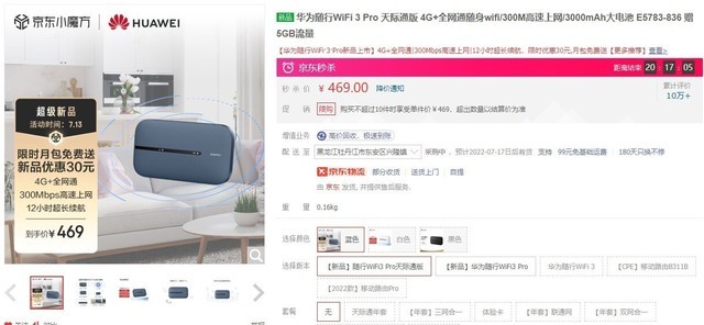 在月初的發布會上,華為推出了隨行WiFi 3 Pro,標准版定價499元,首發469元,年包套餐版1098元,今日上午正式開售。