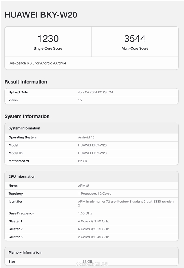 其CPU由4 Cores@1.53 GHz、6 Cores@2.15 GHz、2 Cores@2.49 GHz組成,預計是8核12線程的麒麟9000W系列。