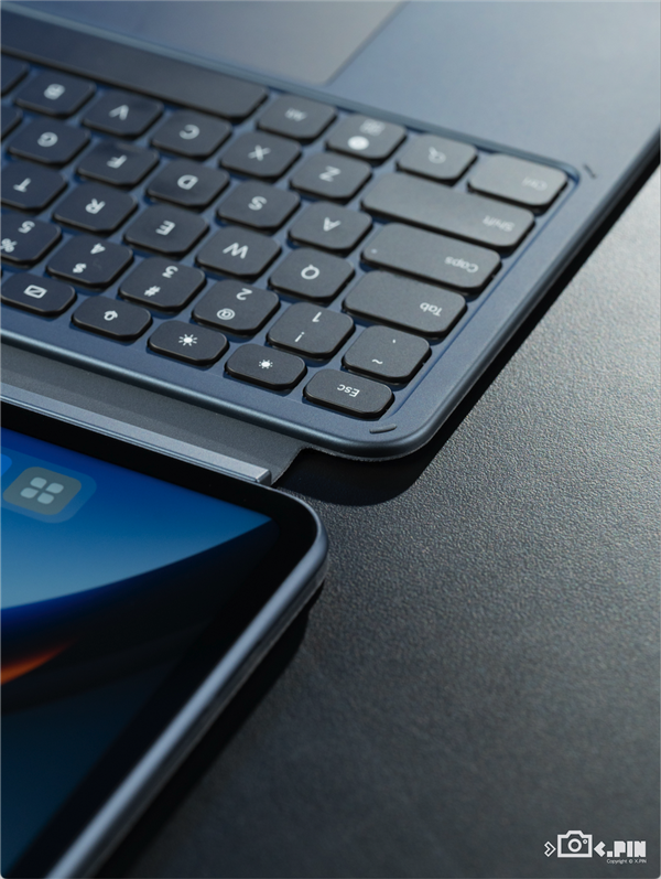 其次就是這個鍵盤套,如你所見,它質感非常好,但是在盒蓋的情況下它跟平板的吸附力非常的弱,加上轉軸用的也是軟體設計,沒法靠增加阻尼的方式來對鍵盤套進行限位。