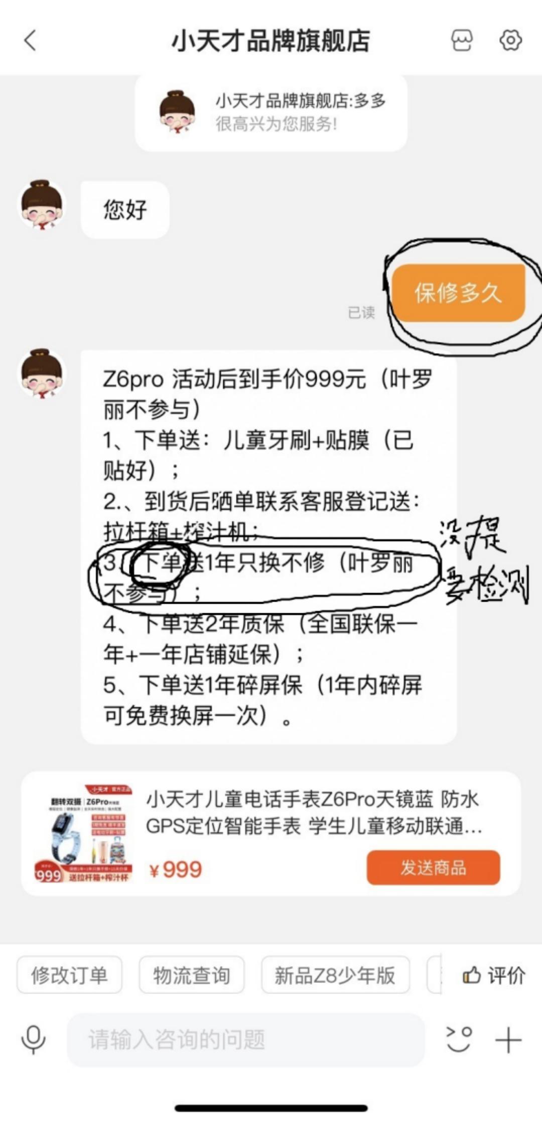 2024年8月13日,廣東深圳的王先生在某電商平臺的小天纔品牌旗艦店購買了小天纔Q1手表,當時店鋪宣傳頁面及客服均確認有“1年質保+1年只換不修”的政策,且沒有限制條件。