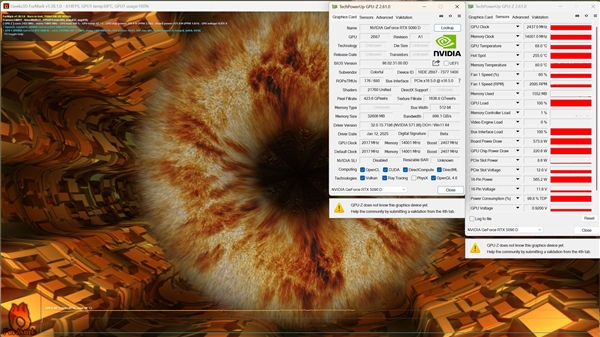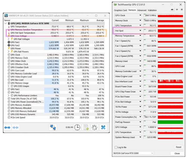 在評測RTX 5090D的過程中(今晚解禁),我們發現,GPU-Z傳感器面板的Hot Spot熱點溫度顯示異常,一直都是255℃,很自然地以為這是GPU-Z尚未支持到位所致,並未在意。