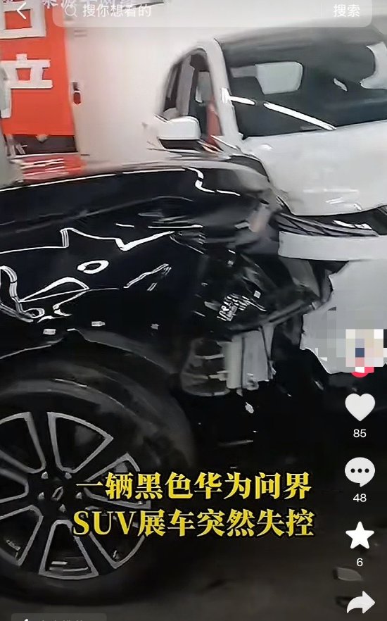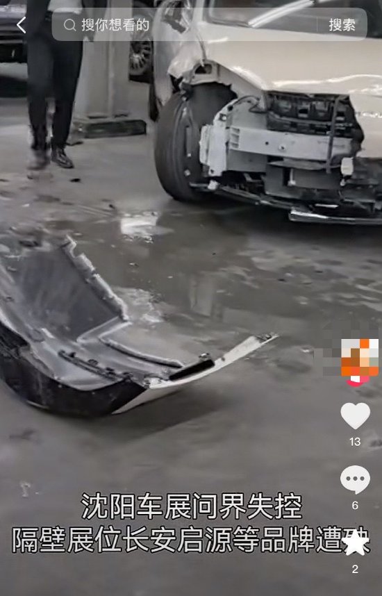 4月14日消息,有網友爆料稱,4月13日沈陽車展上,一輛黑色問界M7突然從展位上衝出,造成附近展位4臺展車受損。