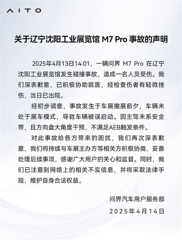 今天,問界用戶服務發布《關於遼寧沈陽工業展覽館M7 Pro事故的聲明》。