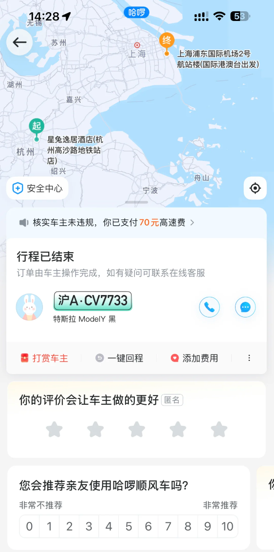 王先生向媒體表示,他是4月11日凌晨在杭州搭乘的順風車,前往浦東機場,他支付了275元的車費,還單獨付了70元的高速費。”