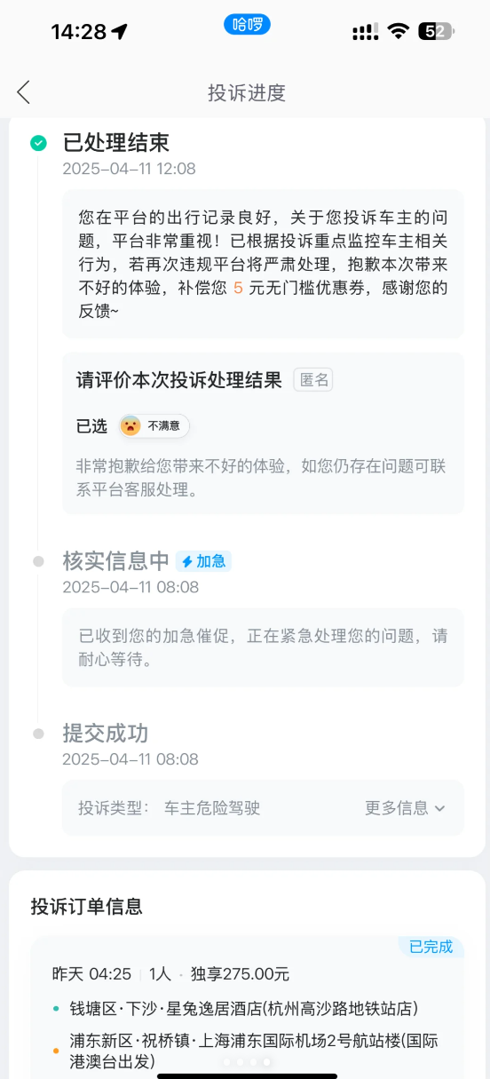 事後,他向順風車平臺投訴司機危險駕駛,平臺方的回復為:“已根據投訴重點監控車主相關行為,若再次違規平臺將嚴肅處理,抱歉本次帶來不好的體驗,補償您5元無門檻優惠券。”