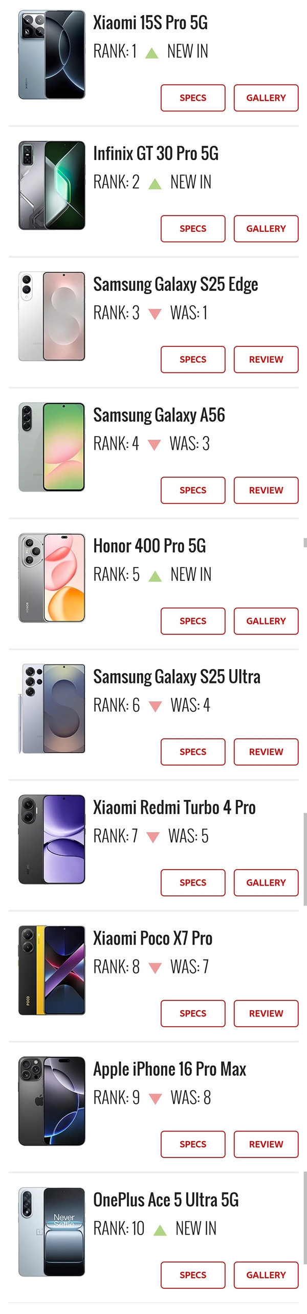 而同門兄弟A56則穩坐第四,顯示出A系列在中端市場持續的強大號召力。