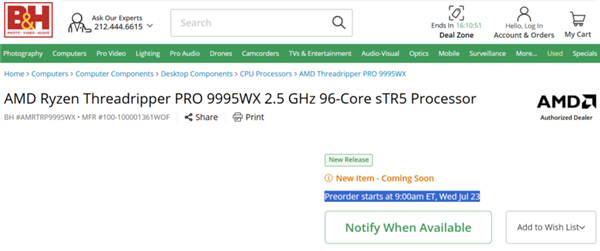 美國大型零售商B&H Photo Video上架了AMD的線程撕裂者9000系列CPU,顯示預訂將於7月23日開始。