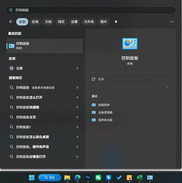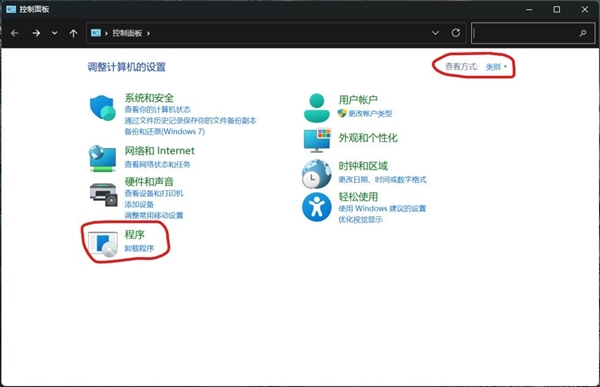 控制面板中的卸載操作也不難,我們在開始菜單右側的搜索框中,輸入“控制面板”就能夠看到,在搜索結果中的控制面板圖標,點擊進入控制面板,默認是類別視圖,這時候有8個圖標。